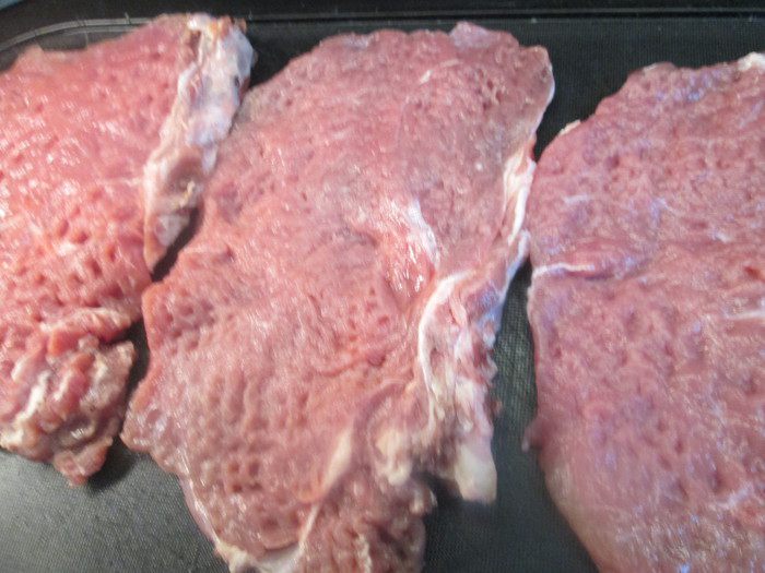 Кусочки мяса осторожно отбиваем, стараясь придать овальную форму. Посолить, поперчить. Духовку разогреваем до 180°С.
