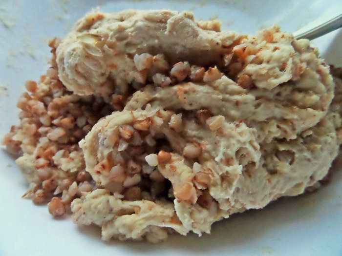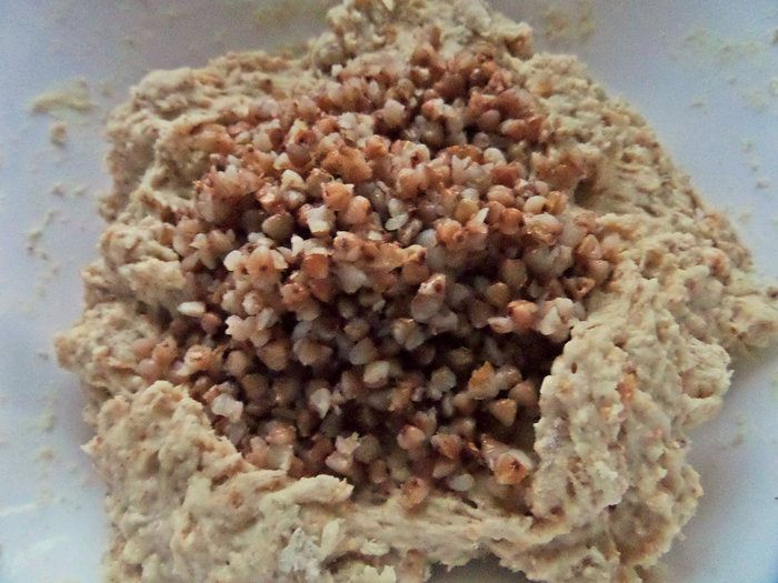 Перемешать тесто и ввести уже отваренную гречку (50 г).