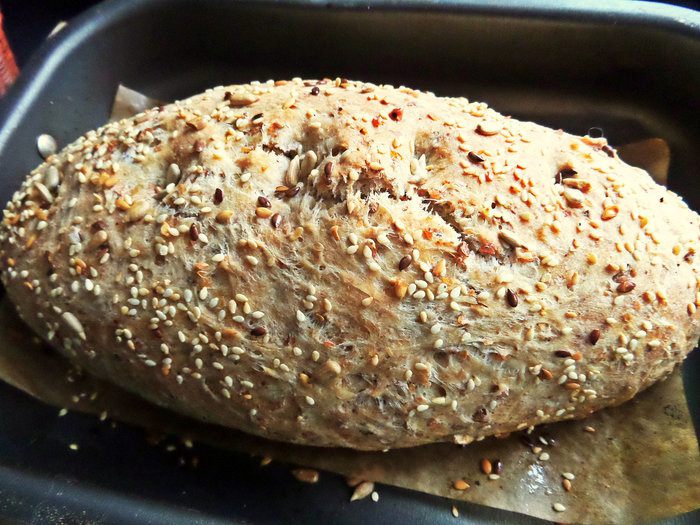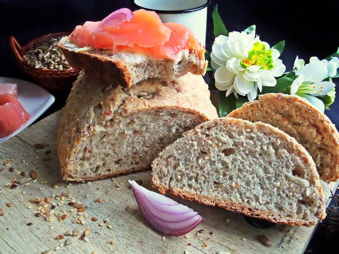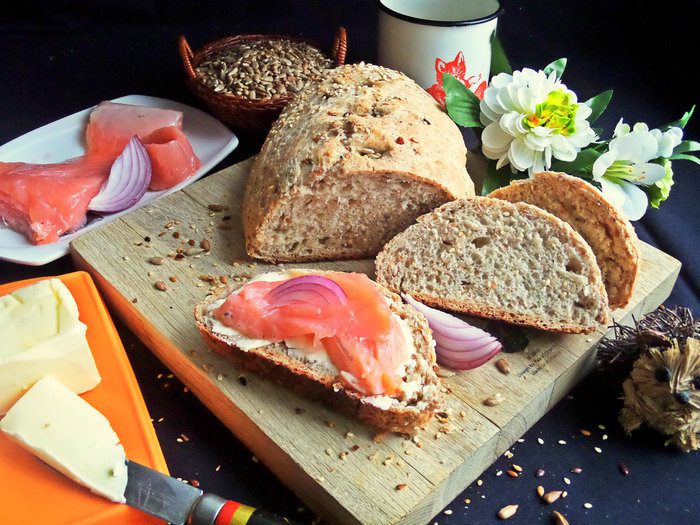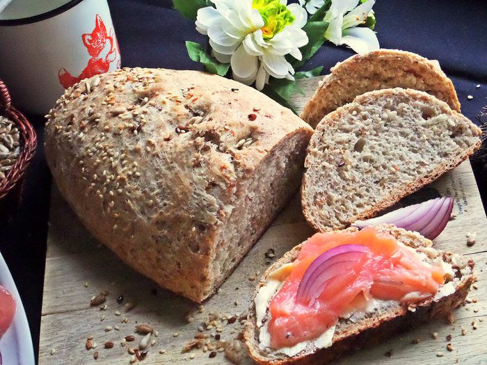 Очень вкусно кушать такой серый хлеб с маслом и малосольной рыбой.