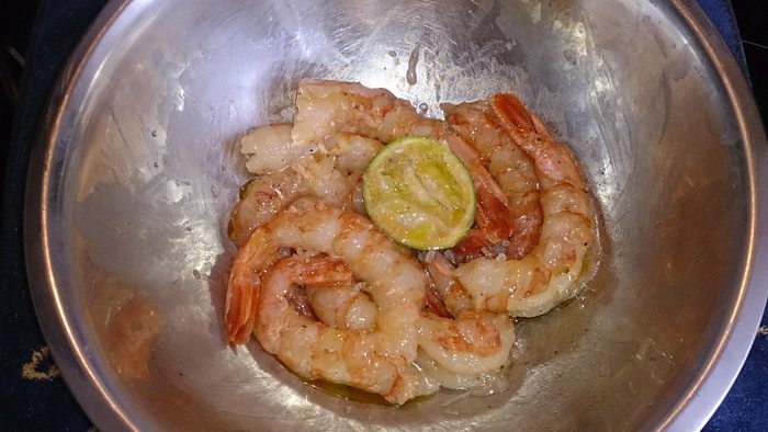 Маринуем креветки в оливковом масле, соке лайма, молотого перца, морской соли минут 5 — 10.