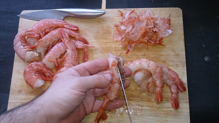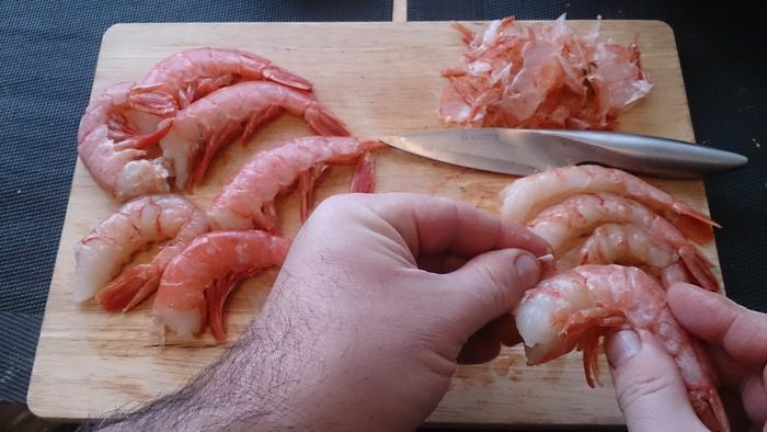 Очищаем от панциря креветки. У меня сыро-мороженные красные тигровые.