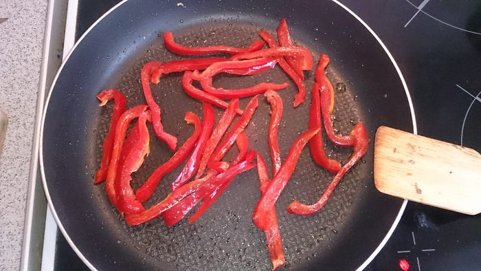 Нарезаем перец соломкой и обжариваем на растительном масле.