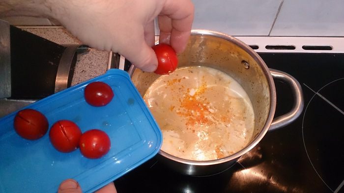 Черри помидоры надрезаем (сок лучше отдадут) и тоже добавляем к кастрюлю.