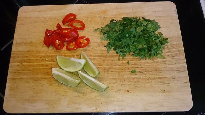 Нарезаем чили, лайм, кинзу.