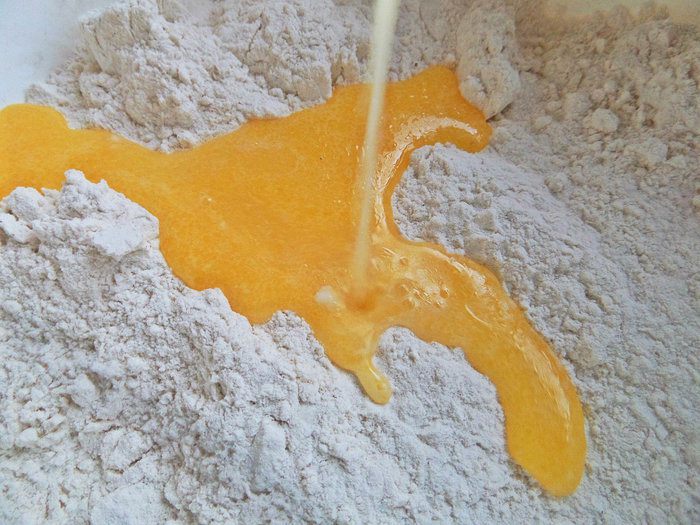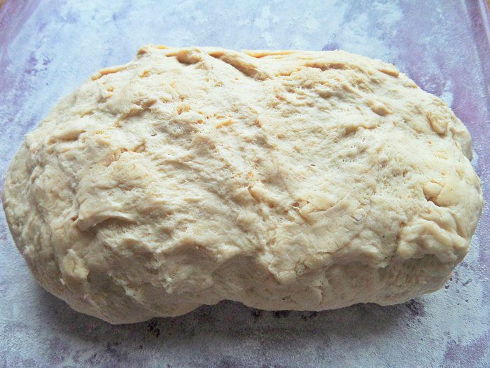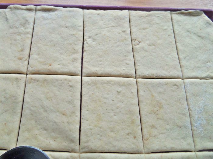 Раскатываем в пласт и делим на квадраты или прямоугольники ножом для пиццы.