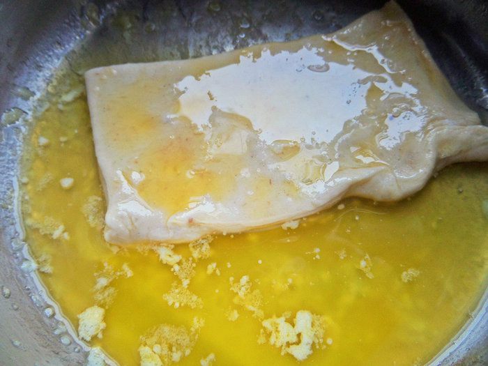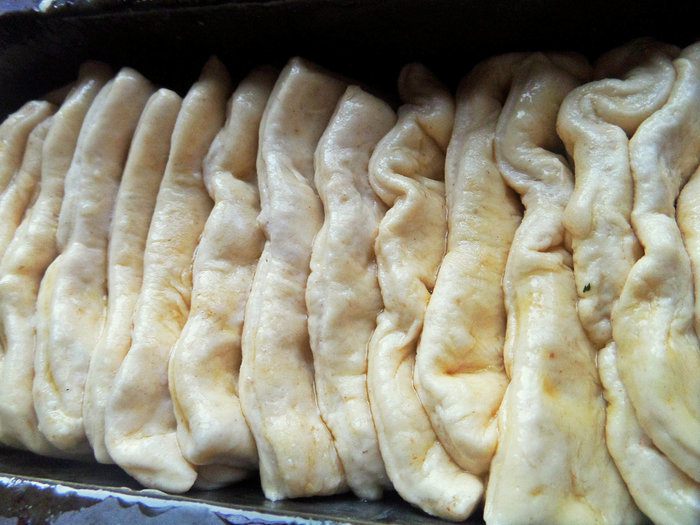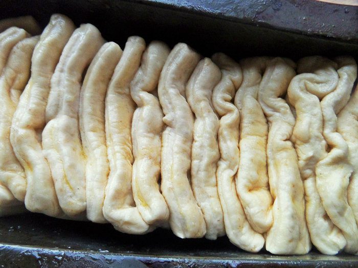 Снова растопить 50 г масла (у меня ушло больше на ложку, так как часть масла стекала уже в форме и не хватило) и обмакнуть каждый ломтик теста в масло.