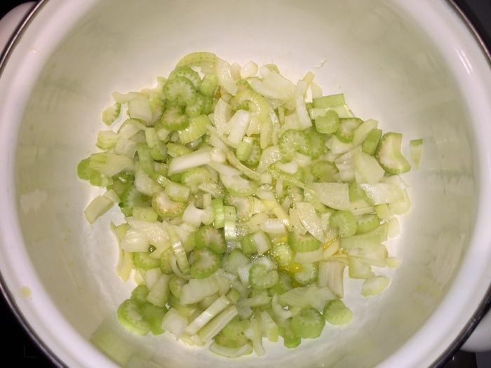 Бульон сразу ставим на плиту разогреваться. Он должен тихонько кипеть, когда он нам понадобится.