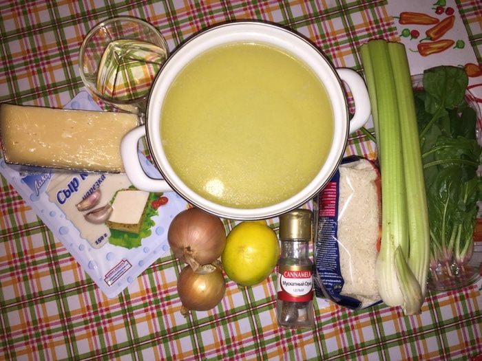 Подготовим продукты. Что важно: бульон может быть любой (куриный, из индейки, говяжий, овощной). У меня из индейки. Литр, это примерно, скорее всего понадобится меньше. Все зависит от риса, плиты и посуды, в которой будет готовиться ризотто.