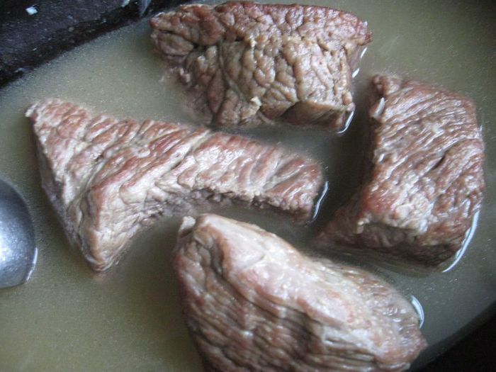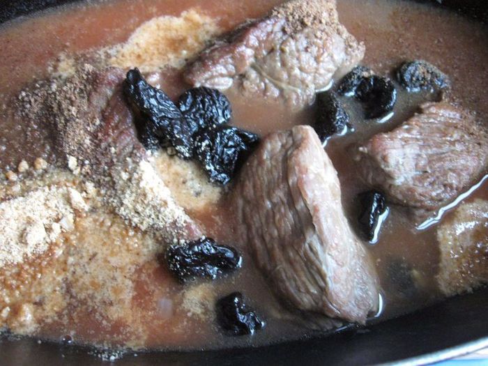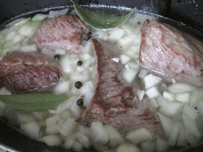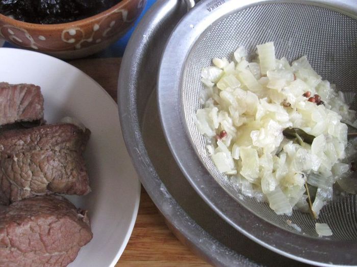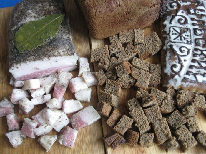 Если у вас нет сухарей из черного хлеба (я использовала бородинский хлеб), нужно их приготовить (высушить в духовке). Также необходим смалец (его у меня не было, был кусочек сала, я его вытопила на небольшом огне, пропустила через сито с двойной марлей и охладила в холодильнике) .Получился топленый жир, который я использовала, не дожидаясь его застывания. Для приготовления мяса вам потребуется чугунная жаровня.