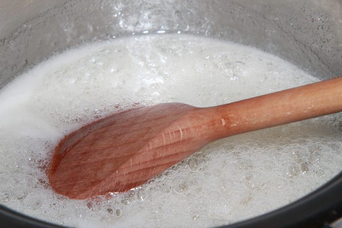 Теперь готовим сироп: агар-агар предварительно заливаем водой. Отмеряем сахар, высыпаем в сотейник, добавляем ванилин, агар-агар с водой и варим сироп, помешивая деревянной лопаткой до полного растворения сахара. Периодически проверяем сироп на вязкость: нить сиропа, стекаемая с ложки, должна повиснуть. Сироп готов.
