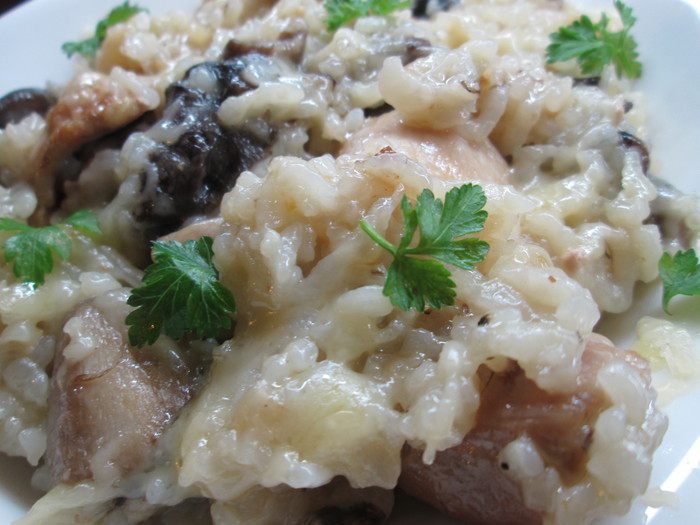 Промытый рис слегка обжариваем на оливковом масле, затем частями добавляем бульон, по мере его впитывания рисом. Далее добавляем сок лимона, соль, перец и готовим минут 20. Через 10 минут добавляем обжаренные грибы и кусочки курицы. В конце варки добавляем тертый сыр, смешанный с растопленным сливочным маслом, нарезанную петрушку. Снимаем ризотто с огня, накрываем крышкой и оставляем на 2 минуты.