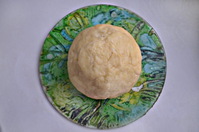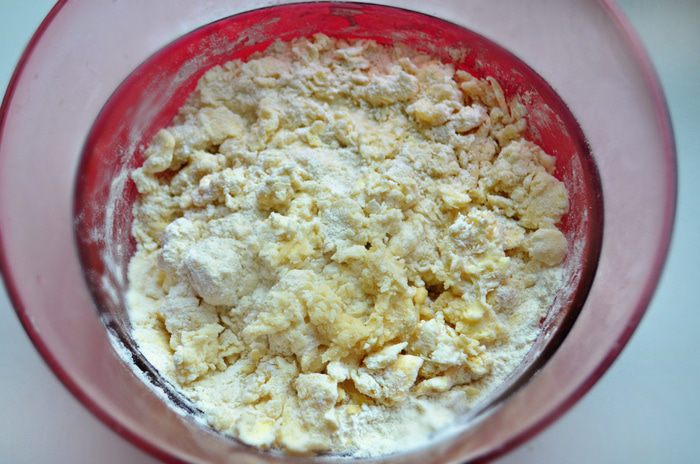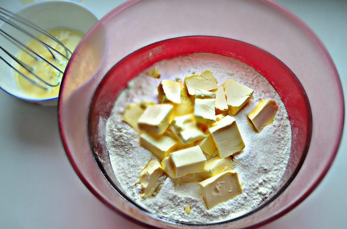 Для этого смешать просеянную муку, соль и сахар. Холодное масло порубить ножом и добить в муку. Ножом измельчить масло с мукой, так чтобы в тесте оставались небольшие кусочки масла. Яйцо слегка взбить вилкой, добавить в тесто и перемешать. Смешать уксус с очень холодной водой, влить в тесто и быстро перемешать.