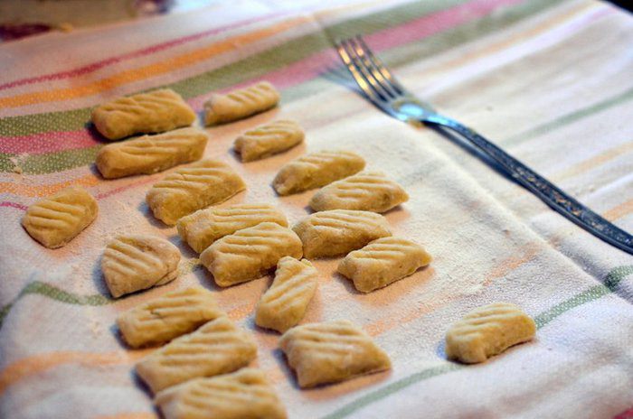 Очищаем от кожуры (я нанизываю его для этого на вилку, чтобы не обжечь руки), разминаем. Добавляем яйцо, муку, соль, вымешиваем тесто. Отделяем немного теста и скатываем его в колбаску, колбаску нарезаем на квадратики около 2 см. В Италии продается специальная деревянная дощечка с полосками, по которой раскатывают ньокки, чтобы сделать на них полосочки. Для этой цели можно использовать обычную вилку: прокатываем готовый комочек теста сверху-вниз. Готово!