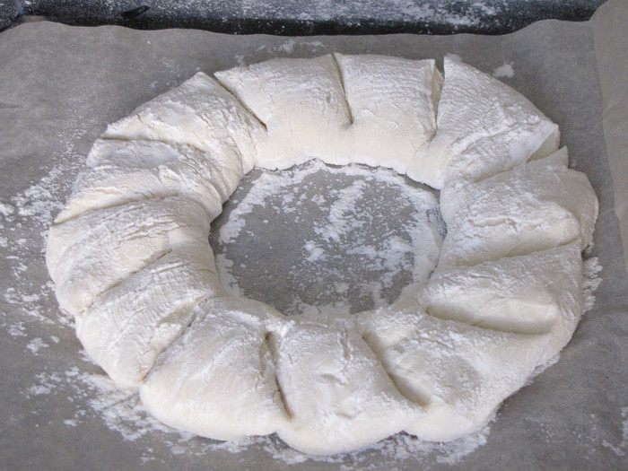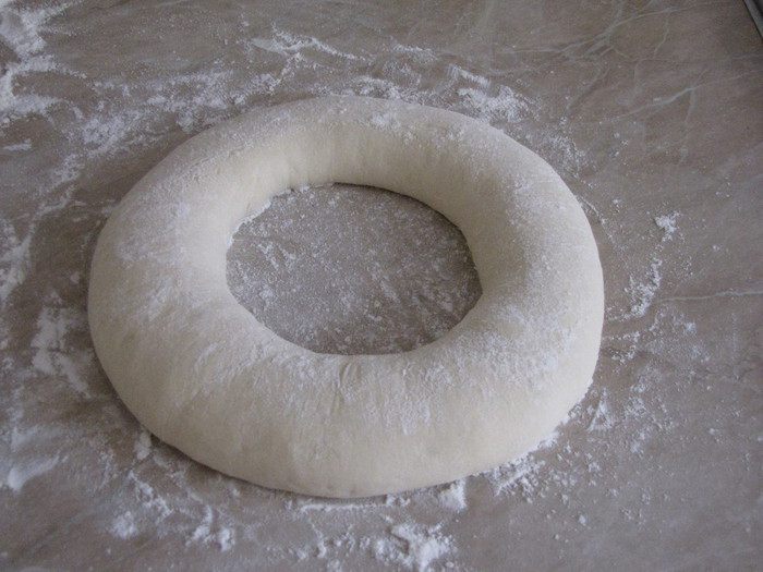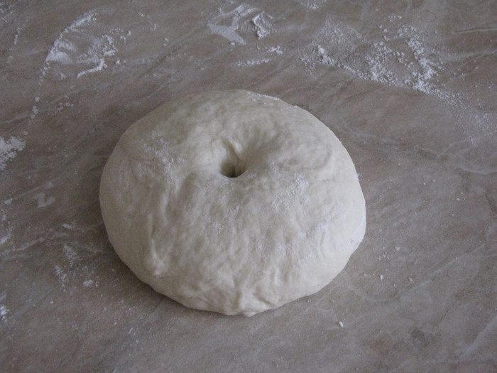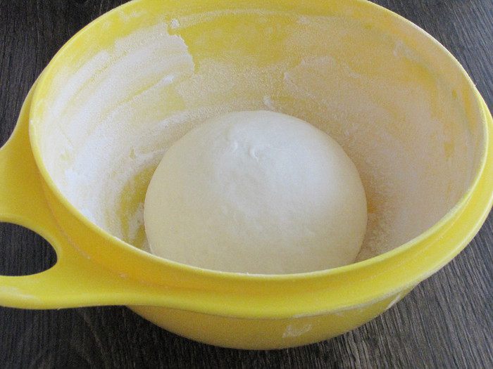 Замесить тесто. Тесто месить не менее 20 минут, оно должно быть мягким и не липнуть к рукам. Скатать тесто в шар, положить в миску, присыпанную мукой, и поставить в теплое место минимум на час, а лучше на два часа. Тесто должно увеличиться в два раза.