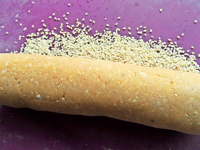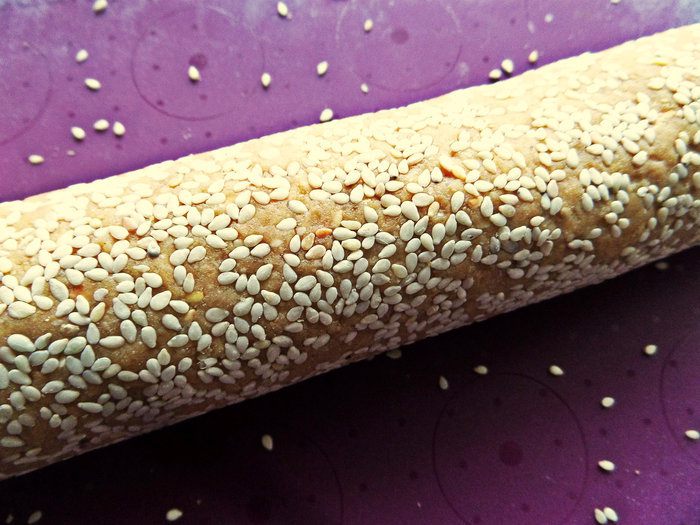 Прокатать по семечкам колбаску из теста.