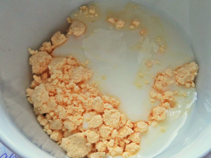 Размешать порошок в кефире с водой. Если брать яйцо, то возможно кефир или вода не понадобятся, или взять их меньше.