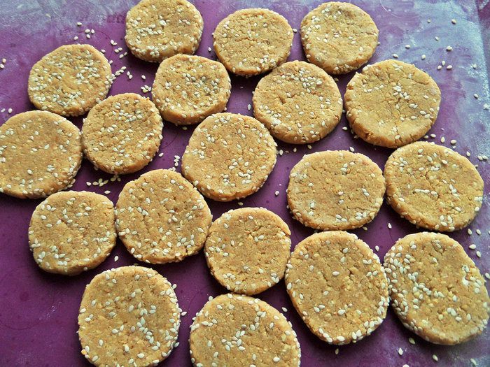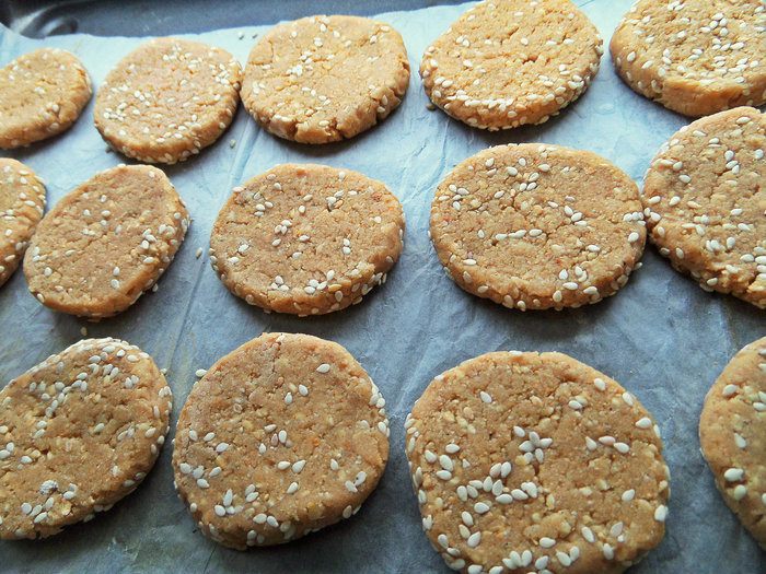 Печенье отличается от многих рецептов кунжутного печенья отсутствием сливочного масла, но в самом кунжуте растительного жира предостаточно. Оно хоть и плотненькое, но не каменное, растворяется во рту от горячего чая и оставляет ореховое послевкусие. Можно готовить с ребенком, ему понравится катать тесто. Рецепт нашла у Вениамина, но изменила формовку и немного рецептуру.