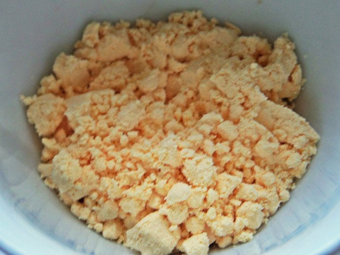 Слепить крутое рассыпчатое тесто. Если совсем не клеится в комок, добавьте ложку-две воды.