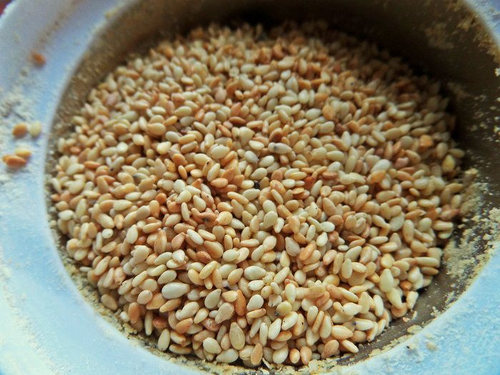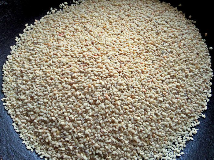Кунжут насыпать на сухую сковороду. У меня чугунная.