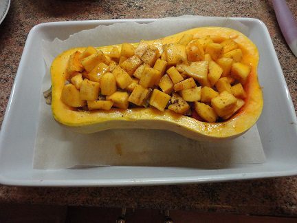 Из основной части тыквы удаляем семена и вырезаем мякоть, которую нарезаем небольшими кубиками, солим и засыпаем приправой гарам массала. Но это на любителя. Можно использовать любые другие, вами любимые приправы. Но гарам массала и тыква — идеальное сочетание в индийской кухне.