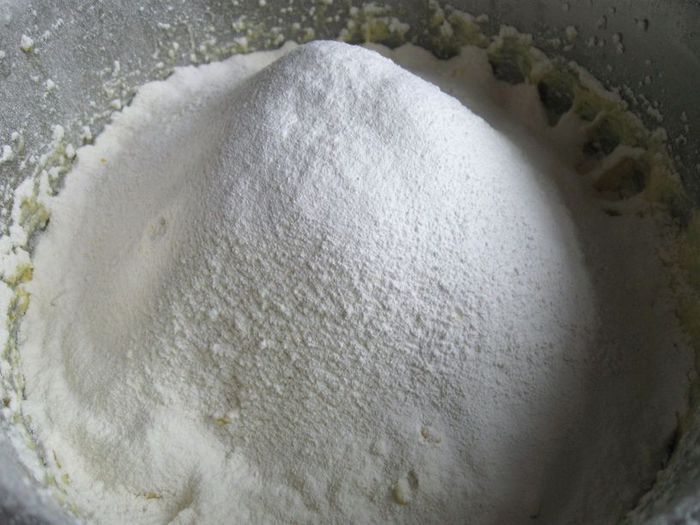 Просеять в смесь муку с разрыхлителем, добавить соль, перемешать.
