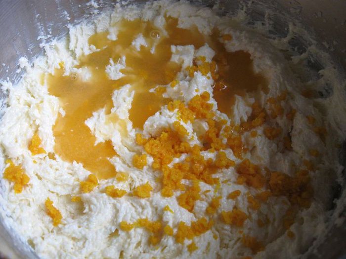 Натереть цедру 1 апельсина, выжать 50 г сока. Добавить к полученной массе сок и цедру апельсина. Взбить.