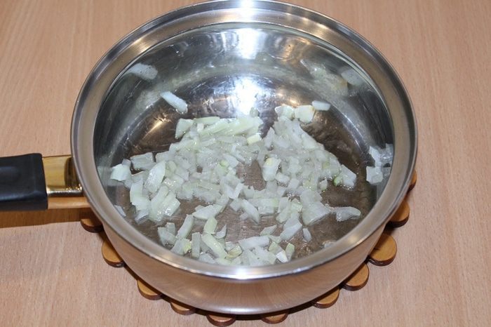 Лук очистить, мелко порубить и обжарить на оливковом масле.