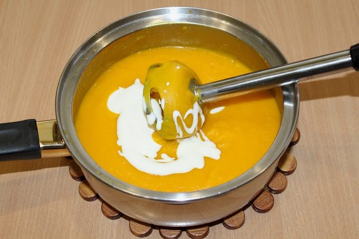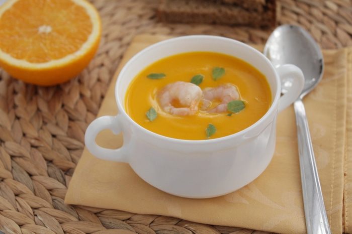 Суп измельчить блендером, добавить сливки. Креветки обжарить на оливковом масле.