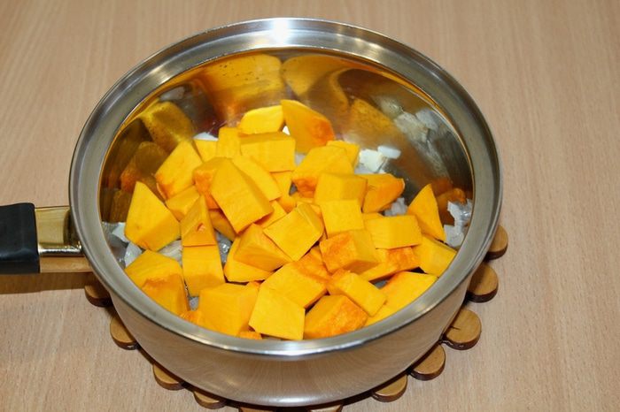 Добавить кубики тыквы, перемешать и тушить около 10 мин, периодически помешивая.