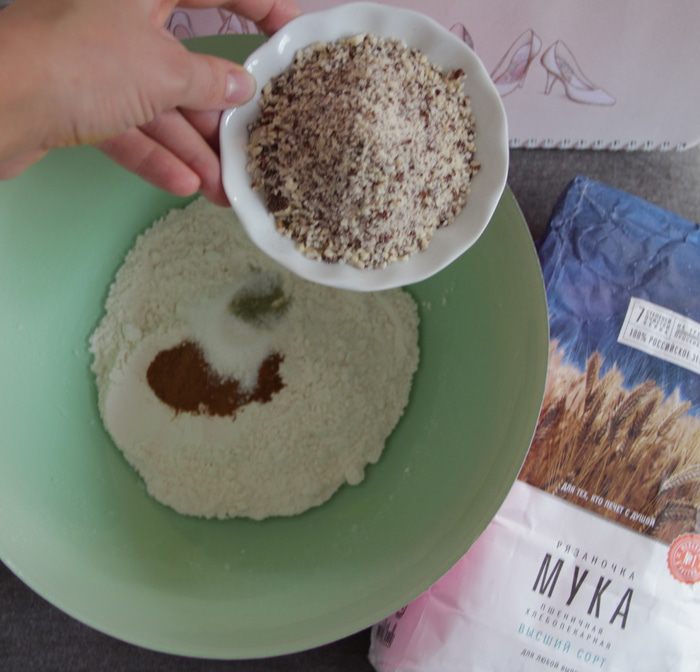 Просеять муку через сито с содой и разрыхлителем, добавить специи и измельченный миндаль.
