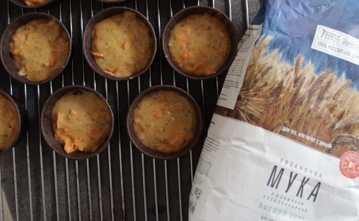 Разложить тесто по формочкам и выпекать в духовом шкафу на 180°С до сухой зубочистки.