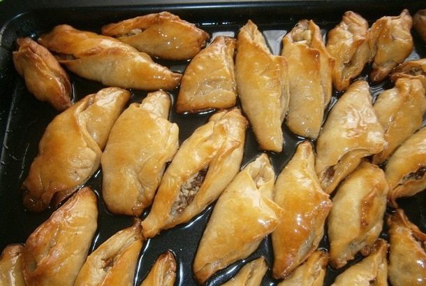Кладем пахлаву в глубокий противень. Можно близко друг к другу. От этого они не потеряют свой вкус.