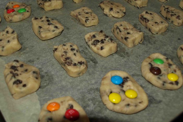 Достать из холодильника охлажденное тесто. Нарезать кусочками. Можно слегка приплюснуть. Или просто выкладывать чайной ложкой на противень (тогда тесто не надо сворачивать валиком).