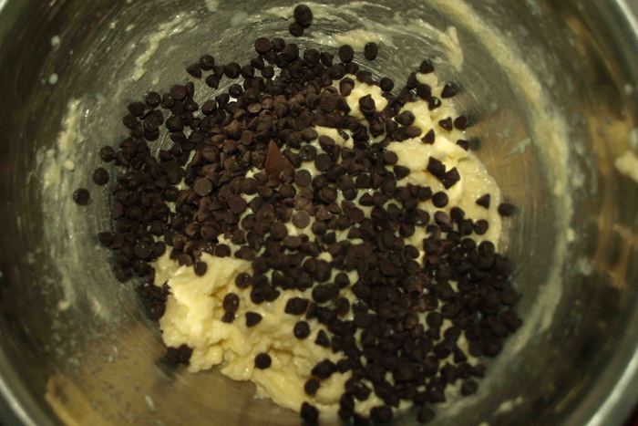 Добавляем шоколадные капли. Если нет шоколадных капель, то можно мелко порубить шоколад.