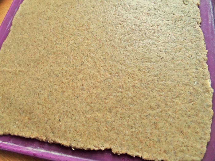 Раскатать на силиконовом коврике. У меня заняло почти всю поверхность коврика 34х30 см. Размеры теста 31х27 см.