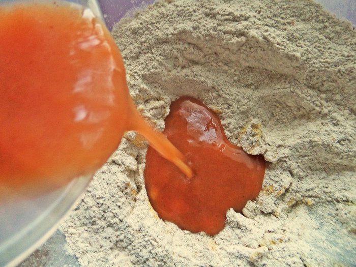 Смешала пюре с водой и влила в муку.