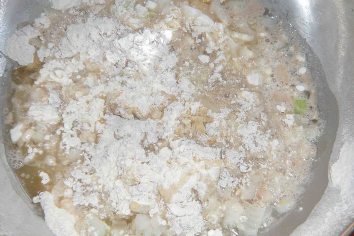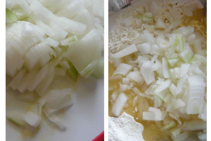 Лук мелко режем. Добавляем к муке лук и растительное масло.