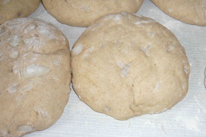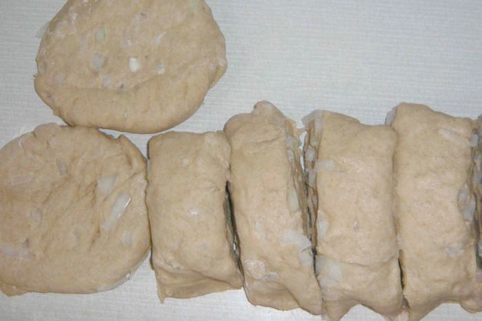 Скатать из теста валик и нарезать на 9 — 10 шт. Или в зависимости, какой размер лепешек вы хотите.