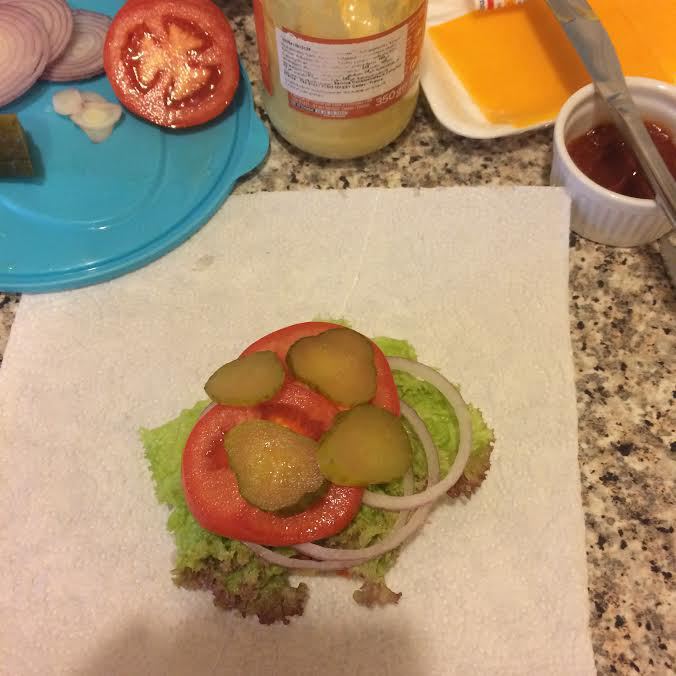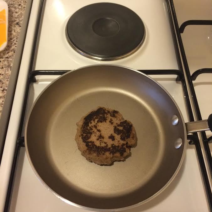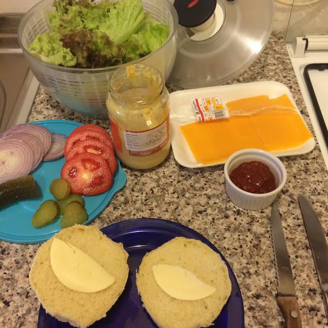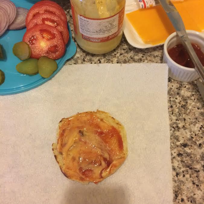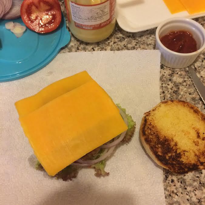 Котлета, чеддер и сверху горячая булочка.