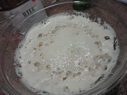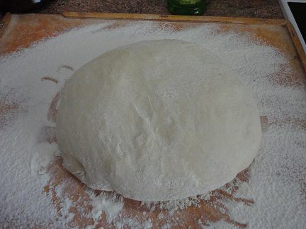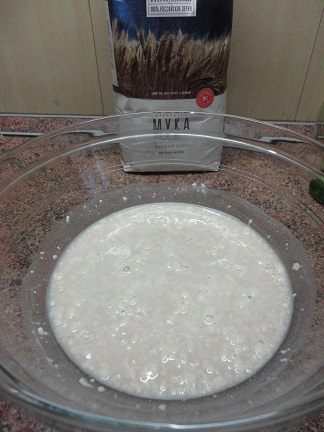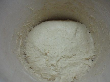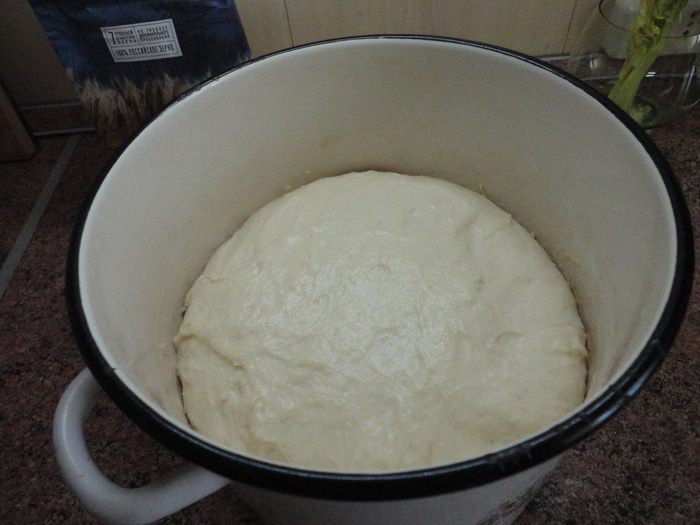В большую емкость (у меня это кастрюля на 7 литров) вылить опару, оставшуюся воду, масляную смесь и начинайте подсыпать муку и замешивать тесто. Количество муки не совсем точное. Вы все знаете, что трудно это сделать. Я просто взвесила пакет с оставшейся мукой и поняла, что мне потребовалось 1 кг 50 г муки. Я вымешиваю тесто минут 10. Оно получилось гладким и приятным на ощупь. Оставляю для подъема и увеличения в объеме не менее, чем в три раза.