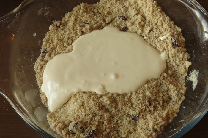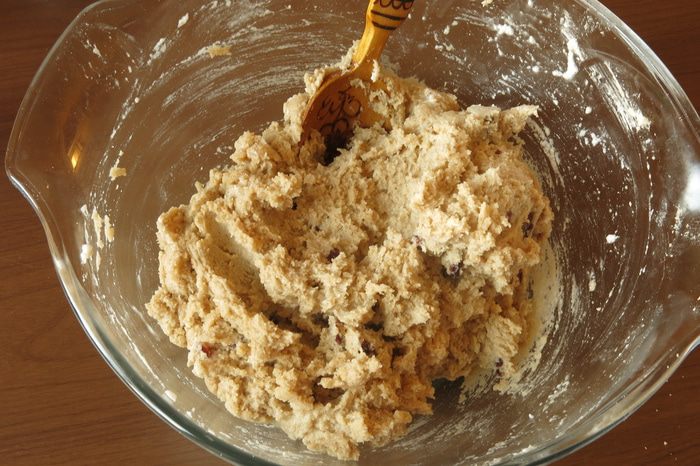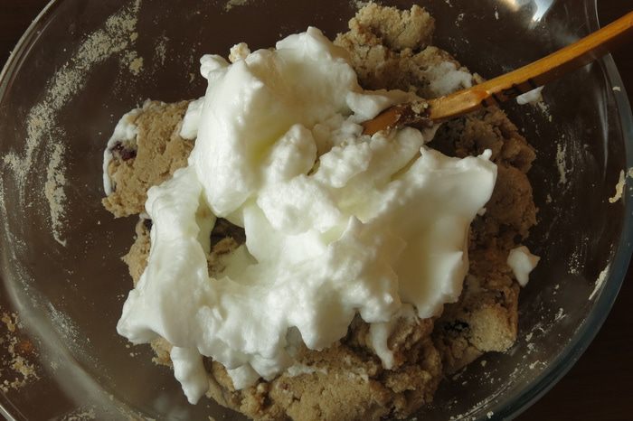 Добавляем клюкву. Вводим белки в тесто. Белки — корректировка, связывают тесто, оно меньше рассыпается.
