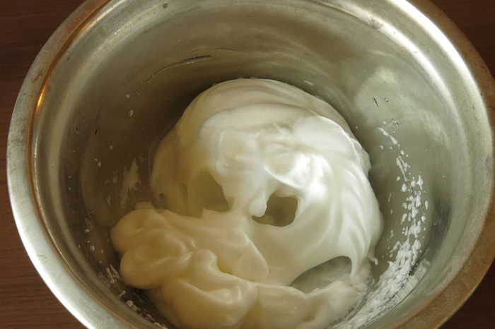 Сбиваем белки с щепоткой соли до мягких пиков.