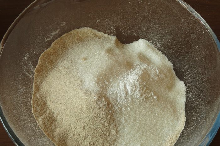 Соединяем два вида муки, сахар, разрыхлитель. Уменьшила количество сахара по сравнению с исходным рецептом, получились довольно таки сладкие бискотти, т.ч. сладость подбираем по вкусу.