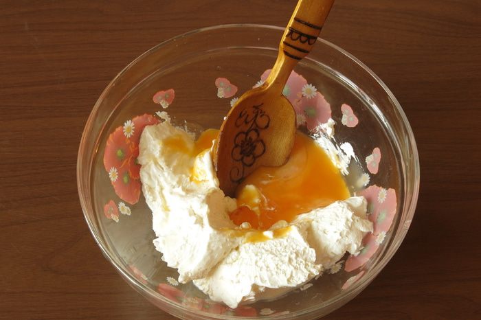Соединяем желтки и сливки сбитые. В исходном рецепте сливки не сбивались.