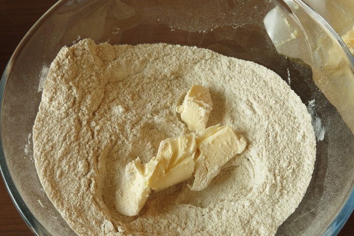 Подготовим два вида муки, рекомендую использовать «Рязаночку», сливки, яйца, сахар, сухую клюкву для начинки, масло.