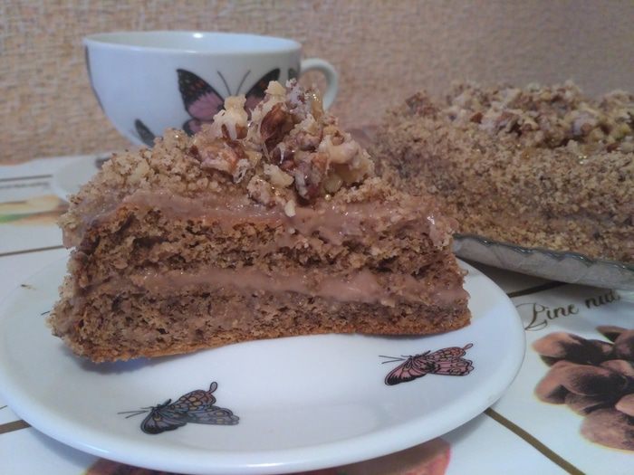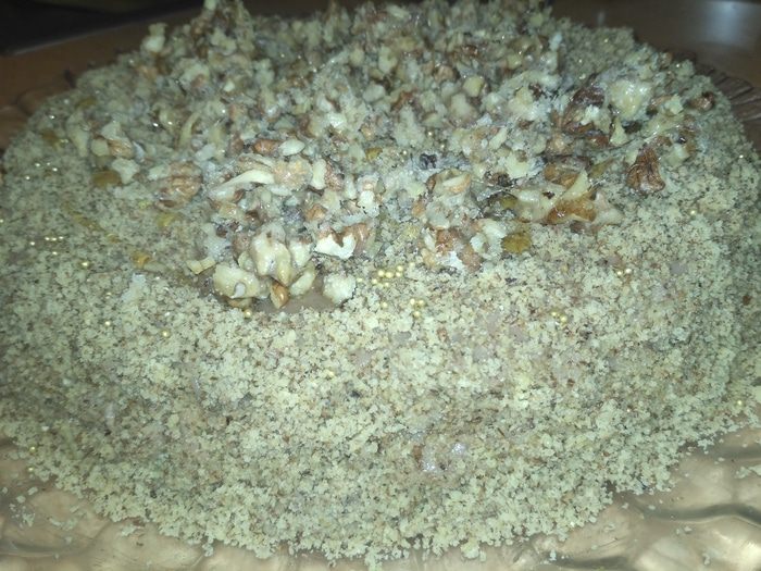 Перемазываем торт и украшаем пожеланию (у меня молотые орехи, а сверху орехи в карамели).