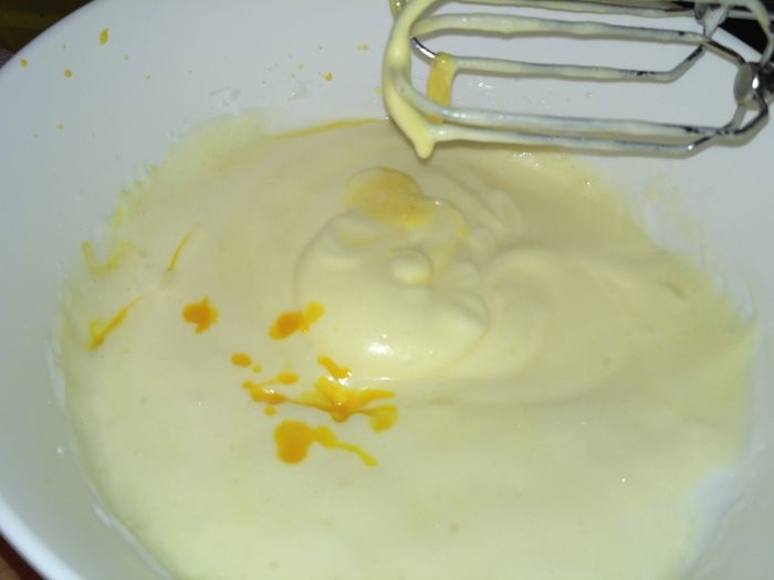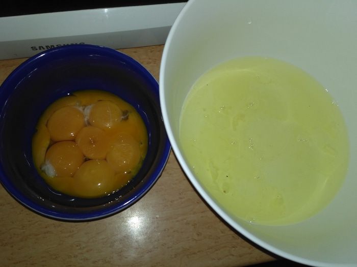 Во взбитые белки ввести желтки.