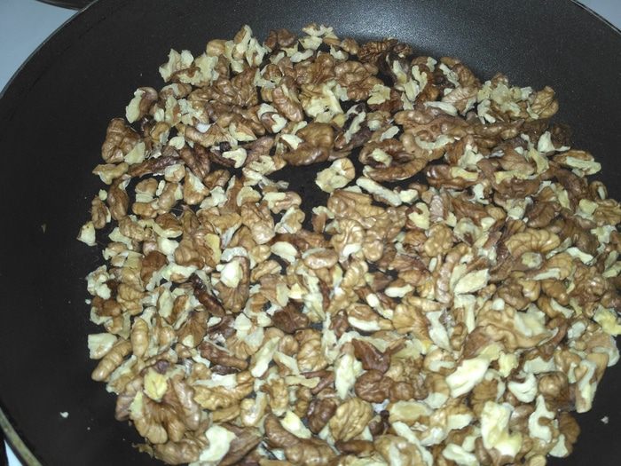 Грецкие орехи подсушить на сковороде без масла.