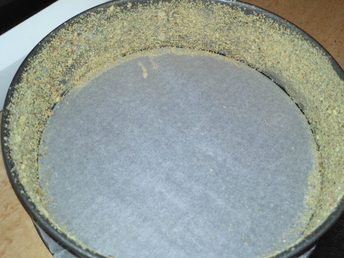 Форму 24 см выстелить пергаментом, бока смазать сливочным маслом и присыпать либо сухарями, либо мукой (у меня сухари).