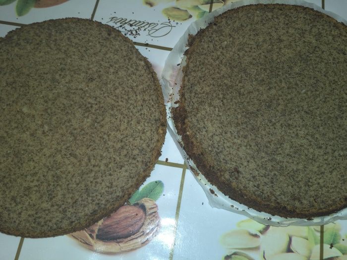 Остывший корж разрезаем на две части (можно и на три).